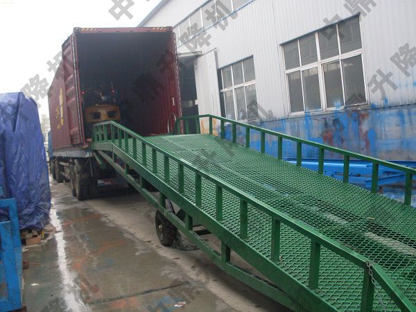 移動登車橋的工作順序:把登車橋牽引至指定裝卸地點----用擠輪塊把輪胎擠住定位-----壓動手壓泵(把橋身壓升到裝卸車輛車盤面的高度)---把車輛裝卸口對準橋頭搭車舌板進行對接----對接完成打開泄壓閥使液壓油缸泄壓(橋身全部無支撐力搭接在車箱上)--用止退鎖鏈把橋身與車廂鏈接鎖住---叉車進行裝卸工作---裝卸完畢---打開鏈接鎖鏈---壓動手壓泵把橋體升起----車輛開走----打開液壓泄壓閥(橋體回落到自身高度)---牽引車將其拉走!