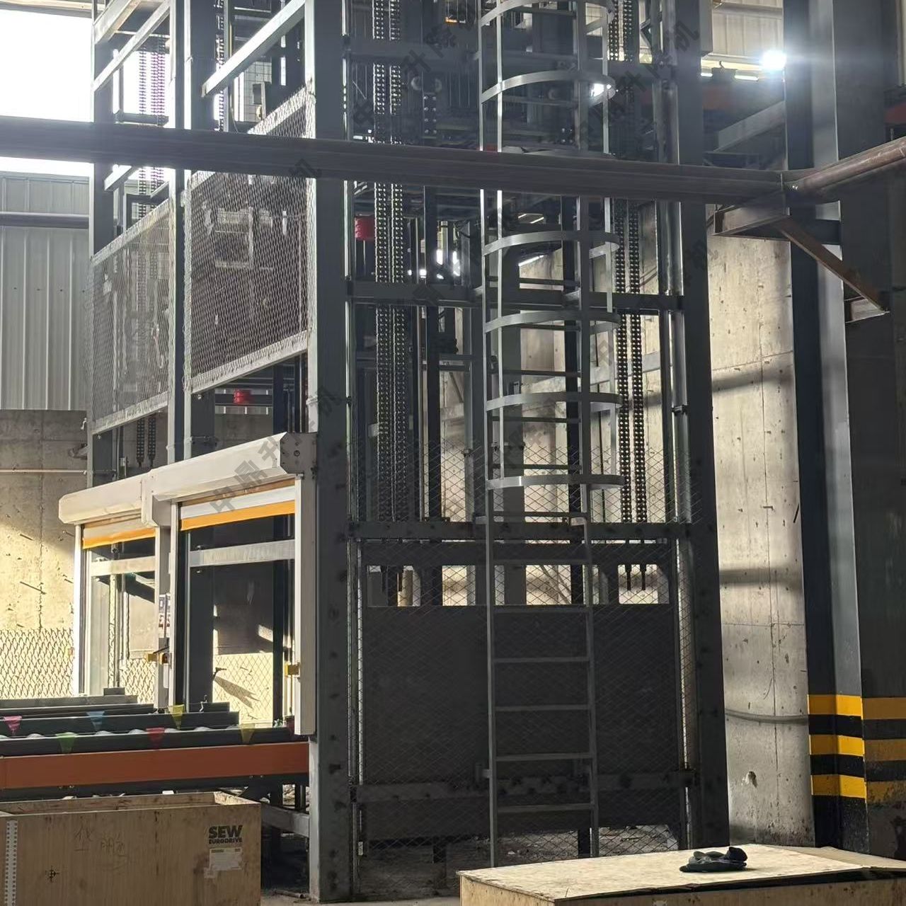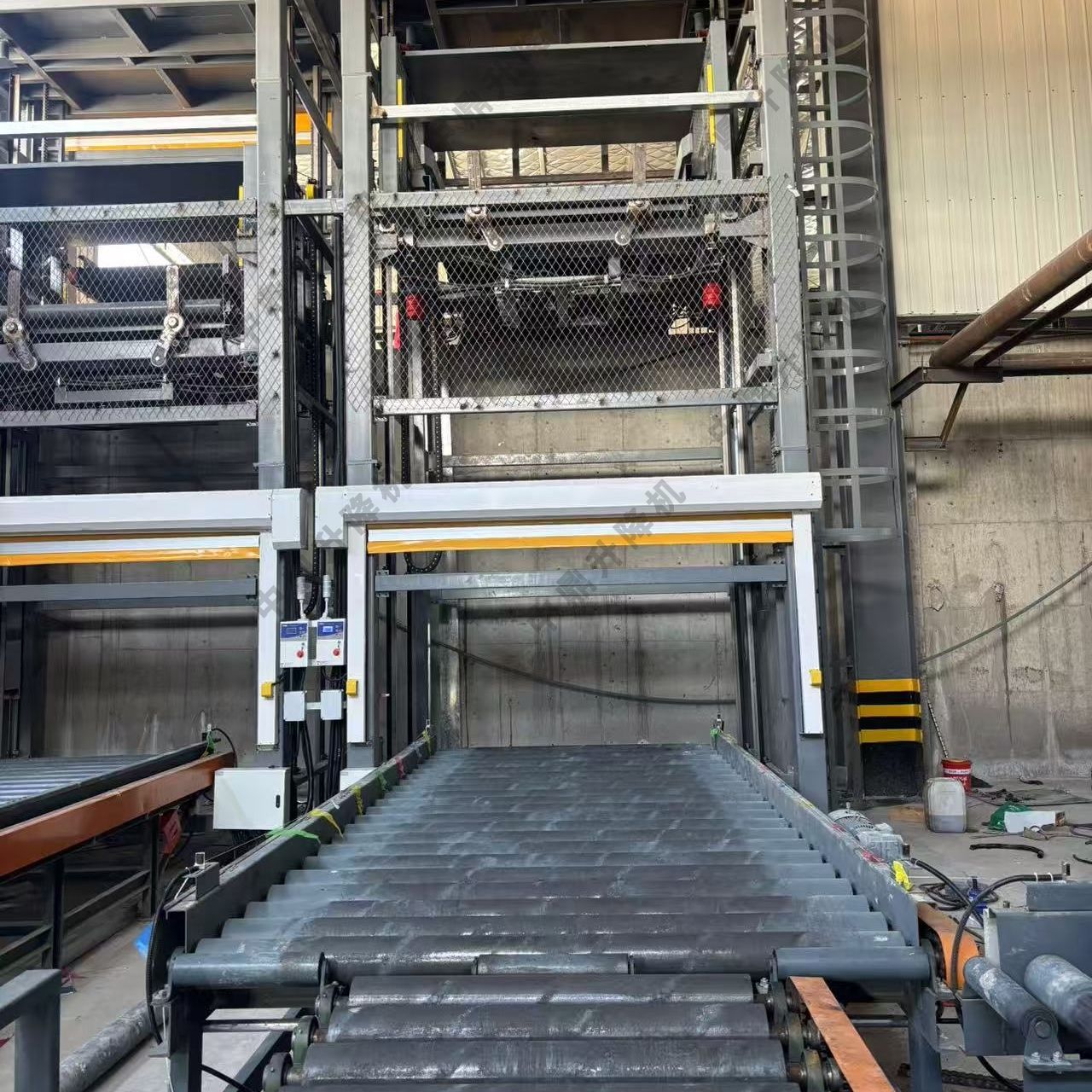 卸載物料:到達目標樓層后,精確定位停止。載貨臺上的出料端輸送機構啟動,將物料送出至該樓層的對接輸送線上。