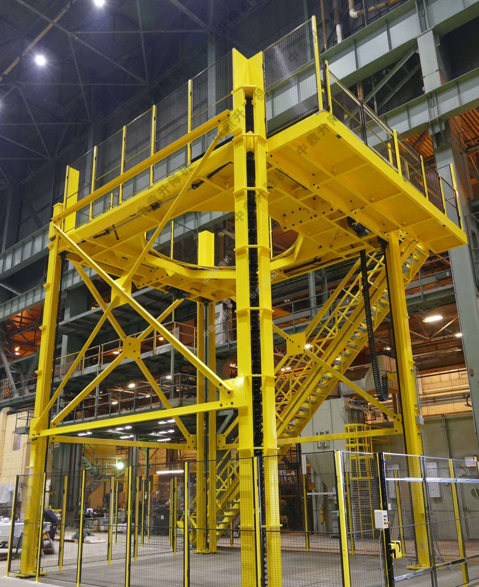 平臺(tái)和樓梯組件的升降是通過放置在每個(gè)角柱上的四個(gè)滾珠絲杠驅(qū)動(dòng)的,每個(gè)滾珠絲杠由強(qiáng)大的電機(jī)驅(qū)動(dòng),每個(gè)滾珠絲螺釘彼此機(jī)械同步。中央光圈開啟驅(qū)動(dòng)是液壓的。